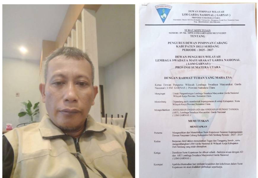20 Juni 2025 – Dewan Pimpinan Cabang (DPC) Lembaga Swadaya Masyarakat (LSM) Garda Nasional Kabupaten Deli Serdang resmi terbentuk setelah diterbitkannya Surat Keputusan dengan nomor 05/SK/DPW.LSM.GARNAS/Sumut/VI/2025. Surat keputusan ini diserahkan langsung oleh Ketua Dewan Pimpinan Wilayah (DPW) LSM Garda Nasional Provinsi Sumatera Utara, Abangda A.M. Sabri, di kantor sekretariat DPW yang berlokasi di Kecamatan Hamparan Perak.