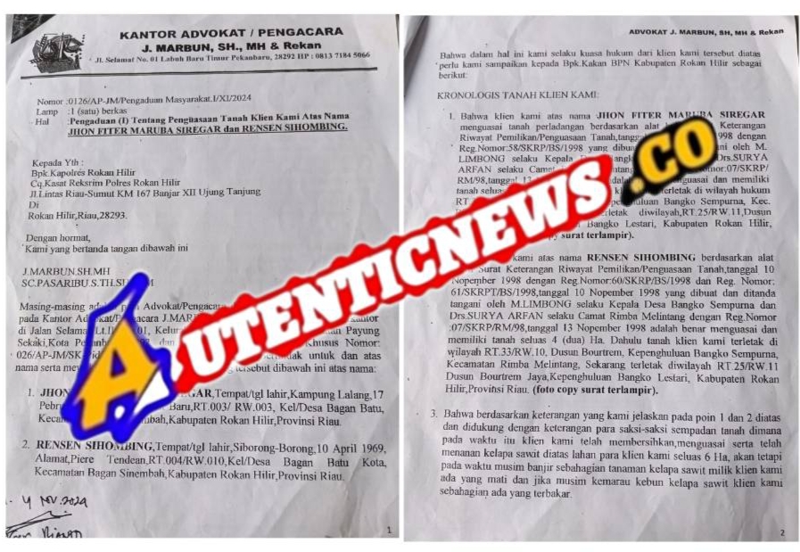 Kasus dugaan tindak pidana penyerobotan dan dugaan pengrusakan kebun sawit kami itu sudah kami laporkan ke Polres Rokan Hilir pada tanggal 18 November 2024, dengan nomor: 0126/AP-JM/Pengaduan Masyarakat.I/XI/2024, tetapi kami tidak tahu sejauhmana langkah-langkah hukum yang telah dilakukan penyidik Polres Rokan Hilir, karena SP2HP merupakan hak bagi pelapor,” ungkap Markus Sitompul, Selasa (14/4/2026).