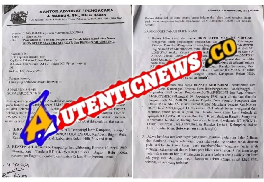 Kasus dugaan tindak pidana penyerobotan dan dugaan pengrusakan kebun sawit kami itu sudah kami laporkan ke Polres Rokan Hilir pada tanggal 18 November 2024, dengan nomor: 0126/AP-JM/Pengaduan Masyarakat.I/XI/2024, tetapi kami tidak tahu sejauhmana langkah-langkah hukum yang telah dilakukan penyidik Polres Rokan Hilir, karena SP2HP merupakan hak bagi pelapor,” ungkap Markus Sitompul, Selasa (14/4/2026).